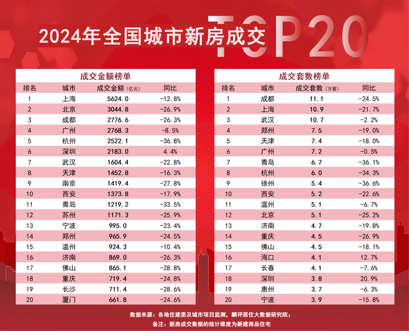 麟评居住大数据研究院发布的2024年城市房地产榜单显示,从新房成交金额TOP20城市来看,上海2024年新建商品住宅成交金额约5624亿元,较2023年下降12.8%,但仍占据绝对领先地位;北京、成都、广州、杭州、深圳新房交易额均在2000亿元以上,特别是深圳2024年楼市表现出较强的韧性,是新房成交金额前20城市中唯一正增长的城市,涨幅为4.4%,这一方面得益于政策利好刺激需求释放,另一方面是以价换量策略奏效。此外,武汉、天津、南京、西安、青岛、苏州6个新一线城市位列第二阶队,2024年新房成交总额均在千亿以上。